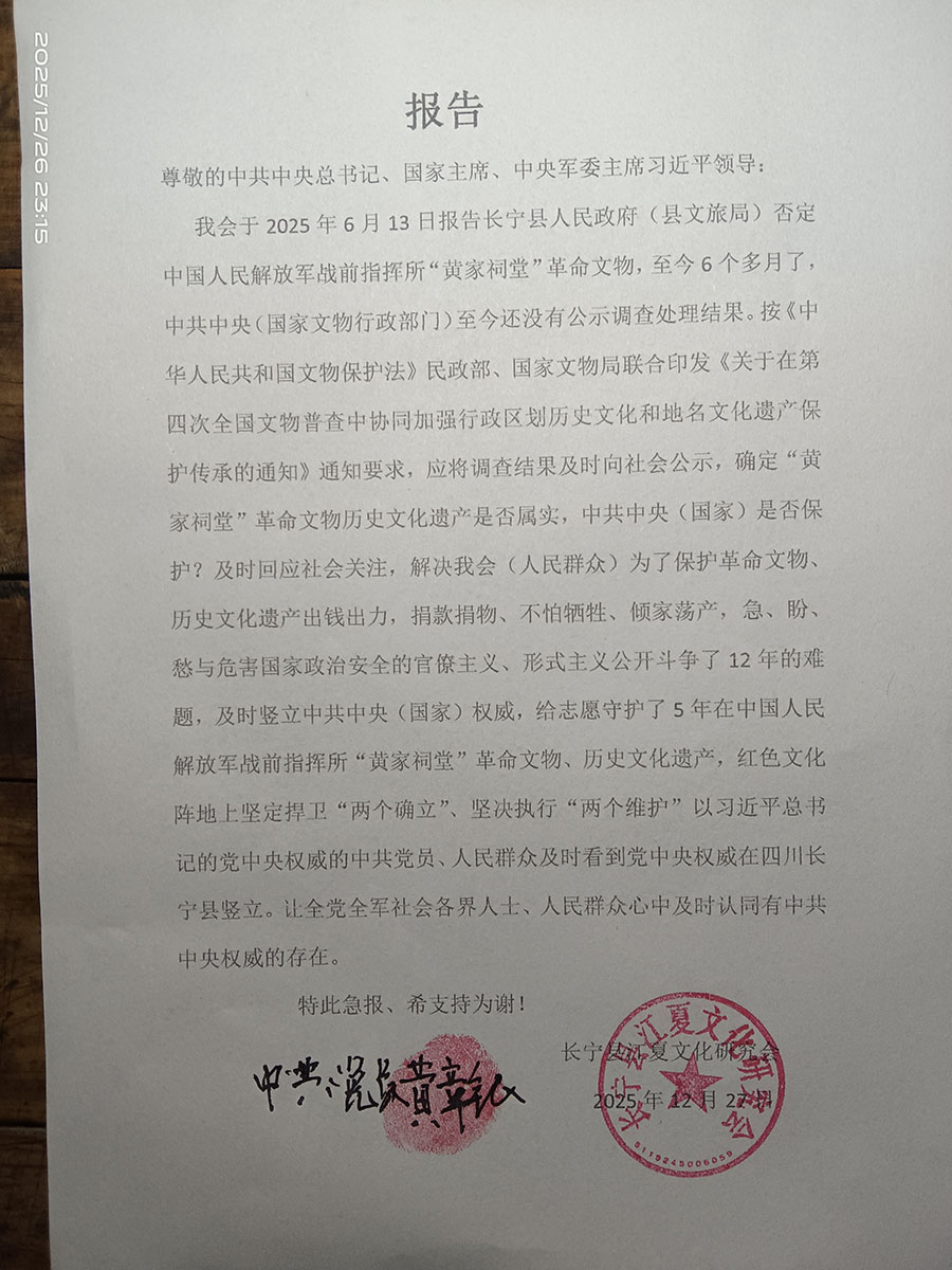 中共党员 黄章银于2025年12月27曰向中共中央习近平总书记的工作报告