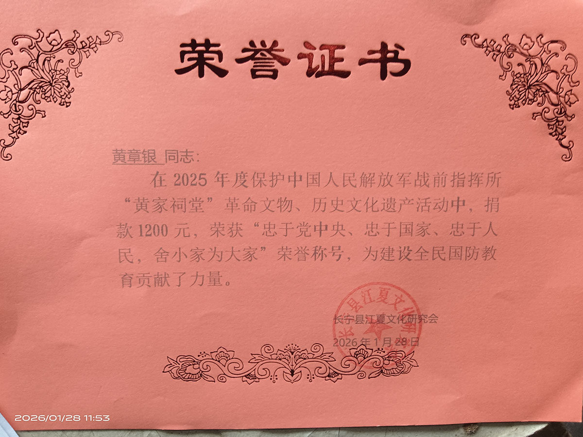 所以2026年工作任务十分艰巨,志愿义务守护中国人民解放军战前指挥所“黄家祠堂”革命文物、红色文化阵地,历史文化遗产的中共党员(先锋模范示范岗)、劳模工匠精神示范岗的同志请记住:在黑暗中,有中共中央、中央军委的保护,有党的二十大历届全会会议精神的支持,要不忘初心、不怕牺牲,忠诚捍卫“两个确立”、坚决执行“两个维护”,坚决维护习近平总书记为全党核心的领导地位,坚决捍卫以习近平总书记为核心的党中央权威和集中统一领导,坚决维护习近平总书记党中央的核心,坚定自我革命进行到底的坚强意志,发扬我将无我精忠报国的江夏精神,不怕牺牲、舍小家为国家,为了理想与信念艰苦奋斗,切实履行忠于党中央、忠于国家、忠于人民、忠于江夏组织、忠于祖宗、忠于祠堂后裔的庄严承诺。勇于自我革命、革命是历史的火车头,真正的革命者永远年轻,坚信以习近平总书记为核心的党中央权威,在任何时候任何情况下都要与以习近平总书记为核心的党中央同心同德,为党尽责、取信于民,守护好红色文化阵地历史文化遗产“黄家祠堂”,就一定能把宏伟的目标变为美好现实,为中国式现代化依靠劳动创造文旅强国根基建设高质量发展、民族复兴伟业贡献江夏力量。
